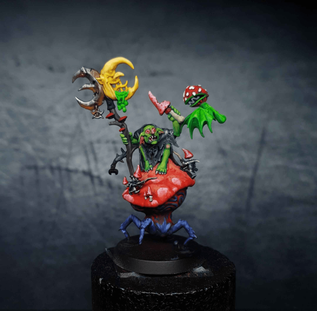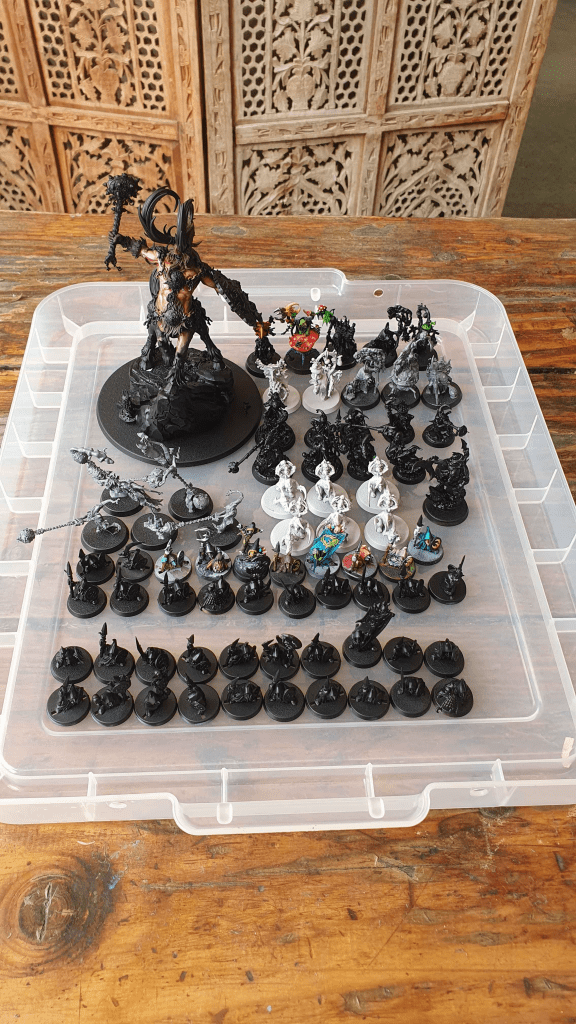 It has been 4 weeks and no games – life has been busy. However I have been able to lay down the first layers of paint for some of the models and primed the whole army minues the endless spells and Loonshrine.